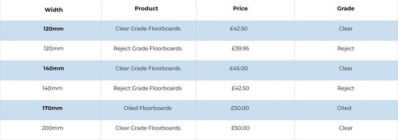 We stock maritime pine solid floorboards at four widths, all at 21mm thickness and 2.0m length.